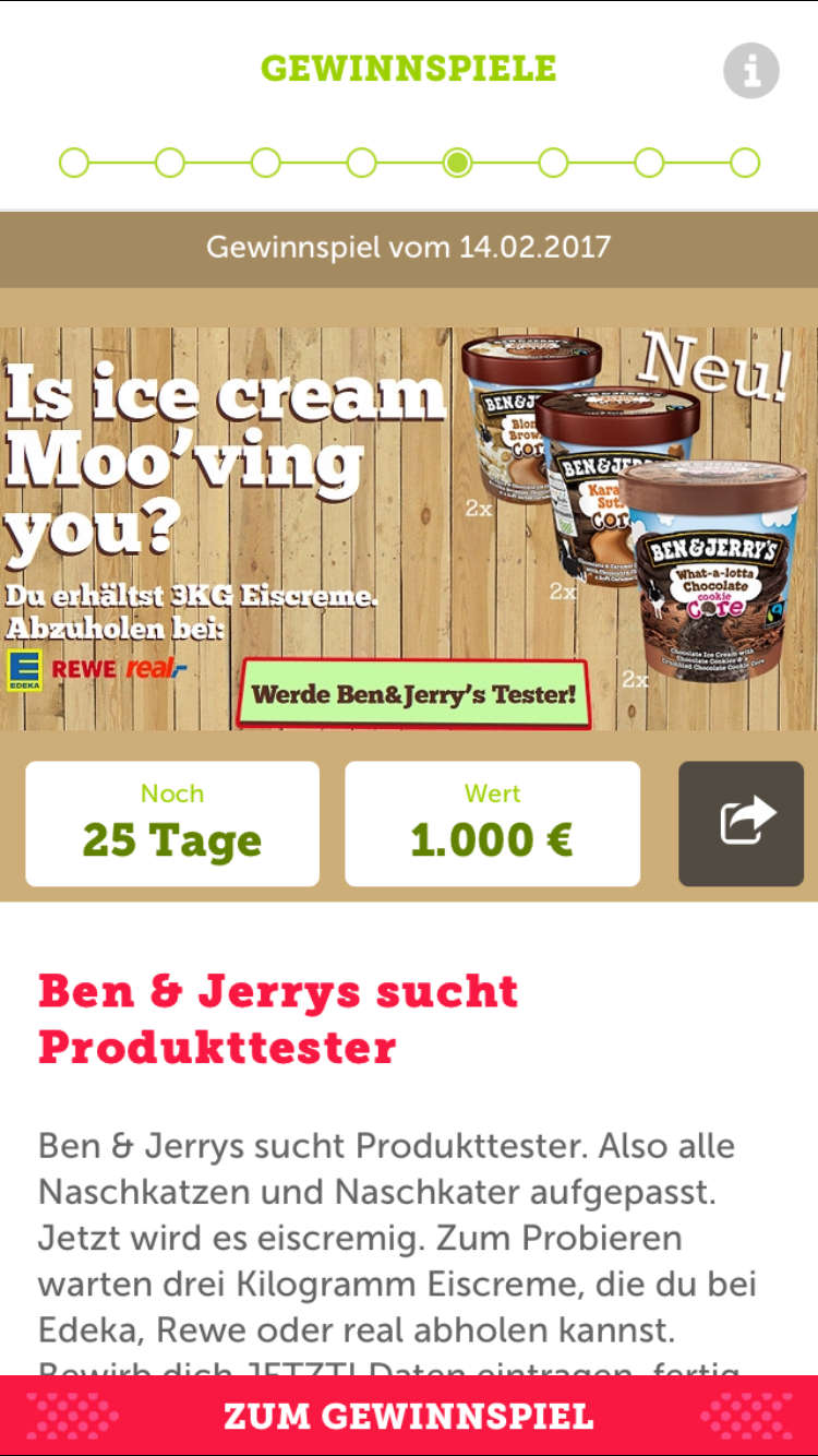 Das ist sehr schade, denn ansonsten macht die “Gewinnspiel des Tages”-App optisch einen rustikalen, aber schicken Eindruck. Leider war von den acht Gewinnspielen eins während des Tests nicht verfügbar. Dadurch wirkte die App auf uns nicht redaktionell gepflegt. Außerdem (siehe mittlerer Screenshot) würden wir gerne verstehen, wie 6 Töpfe “Ben und Jerrys”-Eiscreme 1.000€ wert sein sollen.